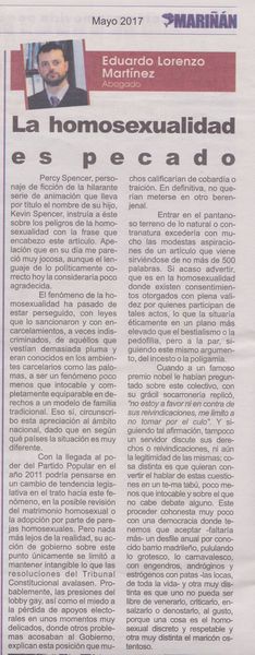 Este año Eduardo Lorenzo Martínez, un señor que se define como abogado, ha querido ser de los primeros en hacer todo esto escribiendo una columna en el número de mayo de O Mariñán, el periódico gratuito de la Asociación de Empresarios de Sada (un pueblo costero a pocos kilómetros de A Coruña que tuvo un pasado más o menos glorioso como destino de turismo discotequero para ibicencos wannabe). Además de abogado, Lorenzo es el secretario-tesorero y suponemos que no ha tenido problemas en publicar su … cosa en este periódico. El artículo se titula “La homosexualidad es pecado”, y ya os podemos decir que nos ha dejado bastante patidifuntas porque nosotros, pobres almas inocentes, pensábamos que los abogados trabajaban con términos legales y no con conceptos religiosos como el pecado, del mismo modo que es la primera noticia que tenemos de que una asociación de empresarios se preocupe por si es pecado o no lo que hacen en sus casas sus posibles clientes.