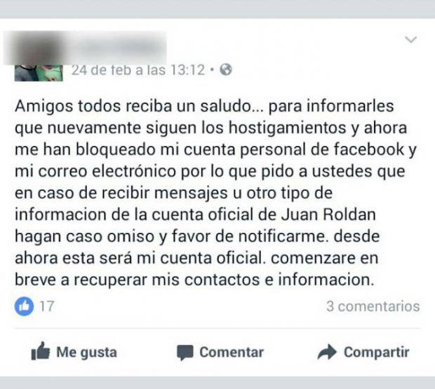 En los últimos meses el propio Roldán había denunciado varias veces en sus redes sociales que era víctima de amenazas. El pasado febrero publicó este mensaje en su Facebook: