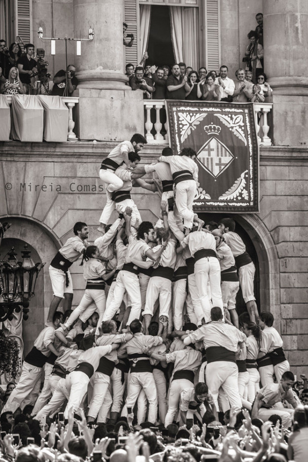 Pues justamente eso, un tres de deu amb folre i manilles no las guarradas, es lo que la colla dels Minyons de Terrassa (se pronuncia «miñóns», no confundir con los putos bichos amarillos) consiguieron realizar en la Plaza Sant Jaume el pasado 25 de septiembre durante las fiestas de la Mercé en Barcelona. Y la fotógrafa Mireia Comas estaba allí haciendo fotos tranquilamente cuando de repente captó esta imagen: