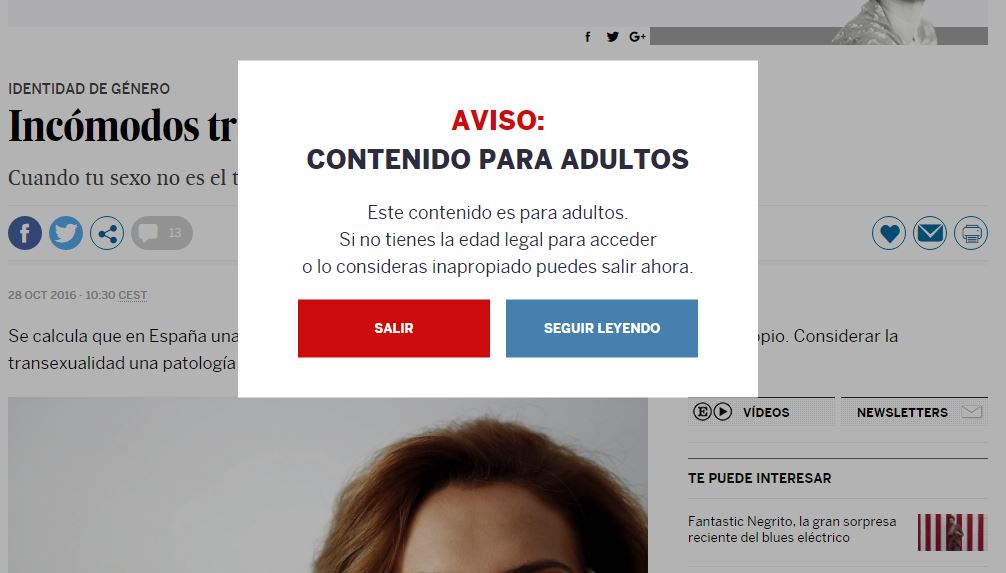 El periódico El País coloca una advertencia de «contenido para adultos» al acceder a un artículo sobre transfobia.