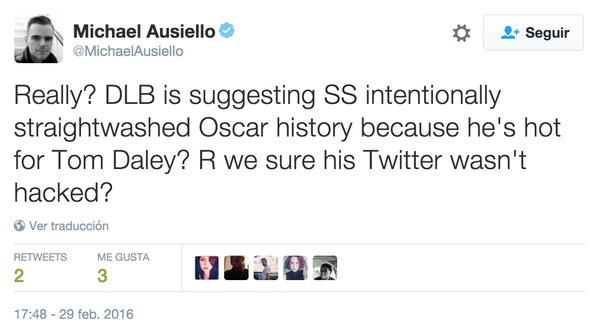 «¿En serio? ¿Dustin Lance Black está sugiriendo que Sam Smith ha hecho un straighwashing intencionadamente de la historia de los Oscar porque le pone Tom Daley? ¿Estamo seguros de que no le han hackeado el Twitter?«