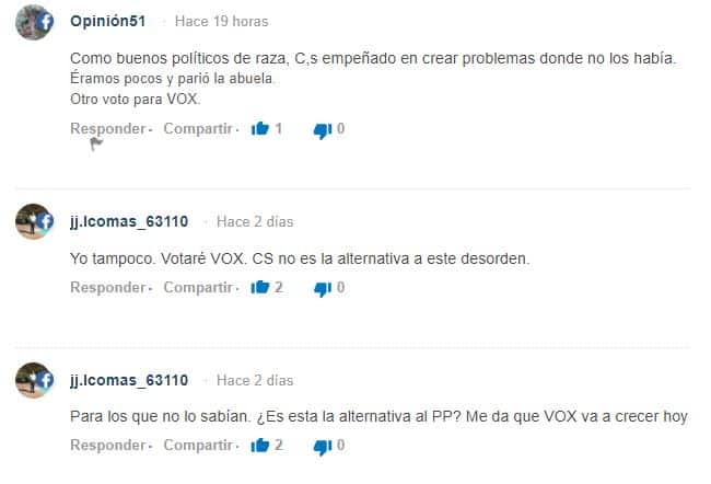 En los comentarios, sus lectores tampoco se quedan atrás. ¿Y qué hace un votante de Ciudadanos cuando el partido naranja defrauda? Pues irse al partido verde. Nos referimos a VOX: