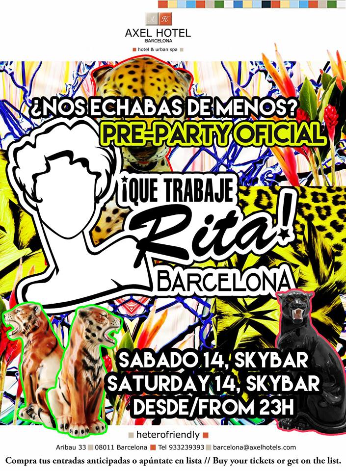 Por si acaso no puedes comprar la entrada ANTICIPADA PREFERENTE en TDTicket.com o no tienes amigos que te apunten en lista, este sábado 14 de noviembre por la noche todo el equipo que ya esté en Barcelona te espera en el SkyBar del Hotel Axel (C/Aribau) en la PRE-PARTY OFICIAL de ¡QUE TRABAJE RITA!