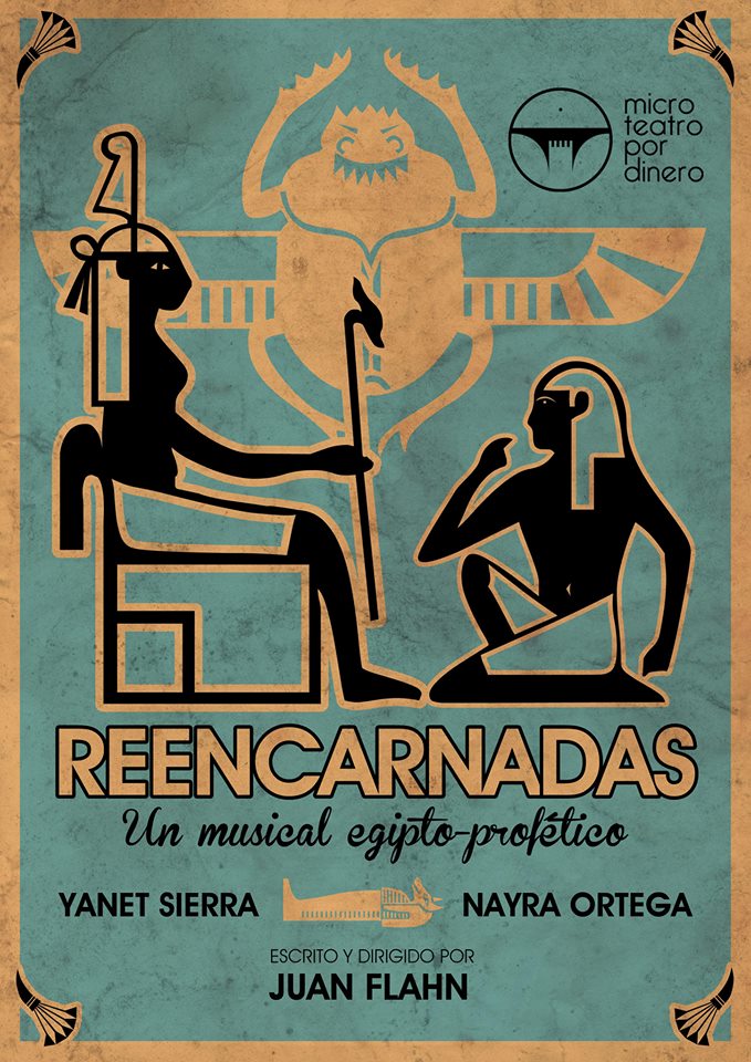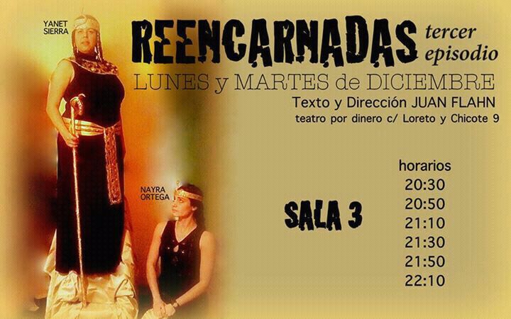 REENCARNADAS es el tercer capítulo de los microfolletines que se han ido representando en Microteatro Por Dinero; una iniciativa que ya contó con dos episodios escritos y dirigidos por Félix Sabroso y Dunia Ayaso (Perdona bonita, pero Lucas me quería a mí); y que este mes de Diciembre presenta el tercero cuyo guión y dirección corren a cargo de Marieli Juan Flahn.