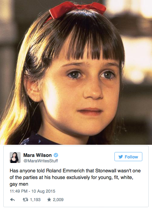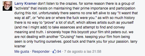 Y también han aparecido autores (como Larry Kramer, el escritor de The Normal Heart) que no han defendido la película (porque no la han visto, recordemos) pero sí el derecho de Emmerich a contar la historia según su visión, teniendo en cuenta que los relatos sobre lo que ocurrió realmente en Stonewall no son exactos. Sí, parece haber consenso sobre quién hizo qué en cada momento, pero es lo que tienen los disturbios: entre pedradas y porrazos nadie se para a documentarlo de forma exacta.