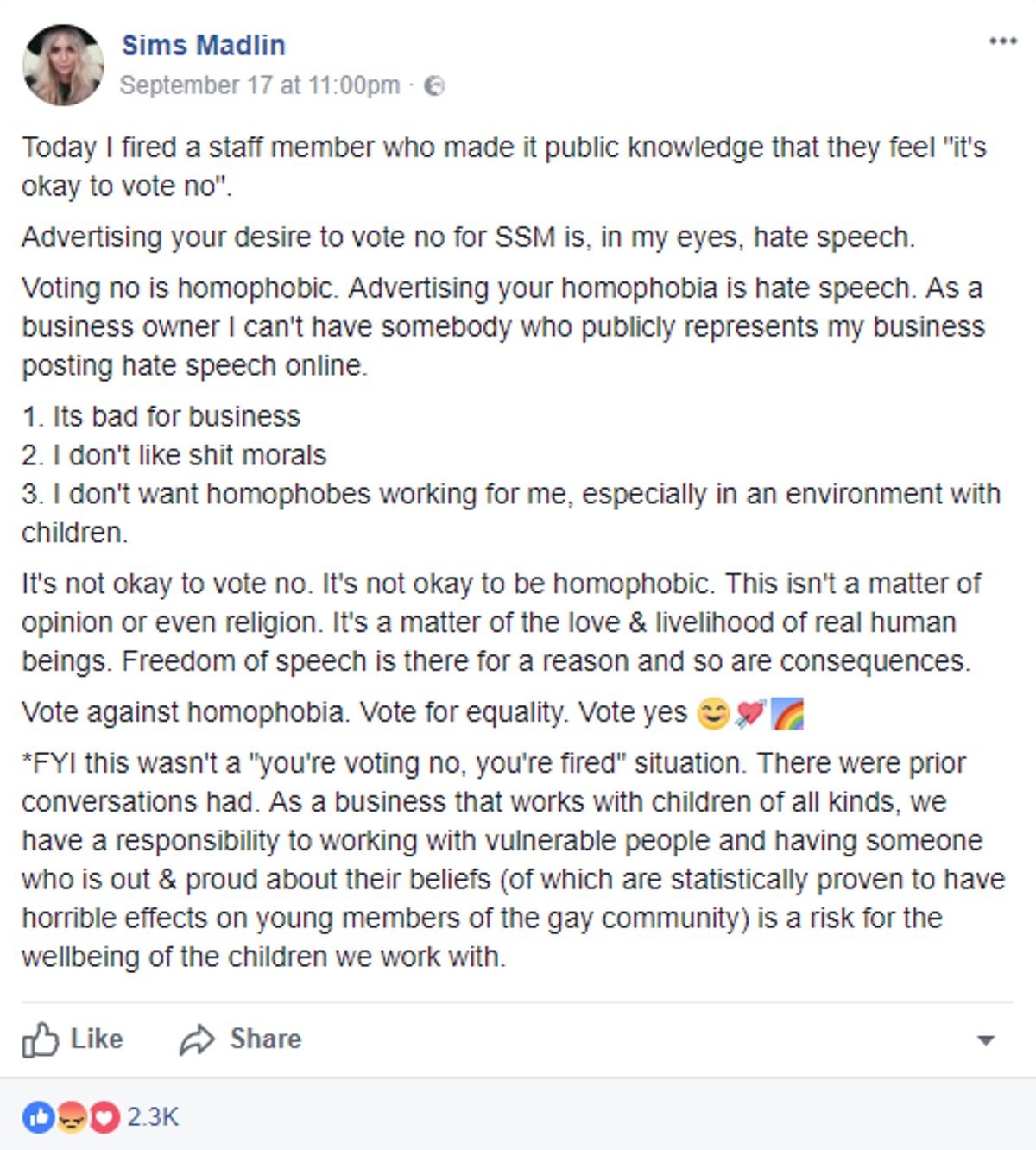 Madeline (la animadora, de 18 años) publicó en su Facebook un mensaje en el que dijo claramente que iba a votar NO al matrimonio igualitario en el voto postal que el primer ministro de derechas Malcolm Turnbull se sacó de la manga para retrasar aún más la legalización en Australia y contentar así a sus socios de gobierno, los ultra conservadores. A raíz de esa publicación en Facebook, Madlin se sentó a hablar con Madeline sobre el tema y decidió despedirla, cosa que Madlin anunció y explicó en su Facebook: