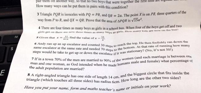 Los alumnos del instituto masculino Royal Grammar School en la localidad de High Wycombe (Buckinghamshire, Reino Unido. Con ese nombre no va a ser en Alicante), se quedaron de piedra al plantarse delante de un examen de matemáticas y encontrarse con la siguiente pregunta. Atención, porque es para aplaudir (en la cara de alguien):